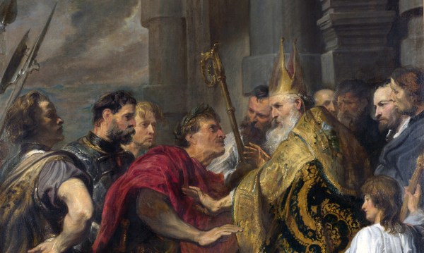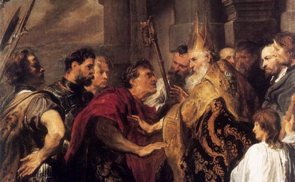 Uitsnede uit het schilderij van Anthony van Dyck, van bisschop Ambrosius die keizer Theodosius de toegang tot de kathedraal van Milaan ontzegt.